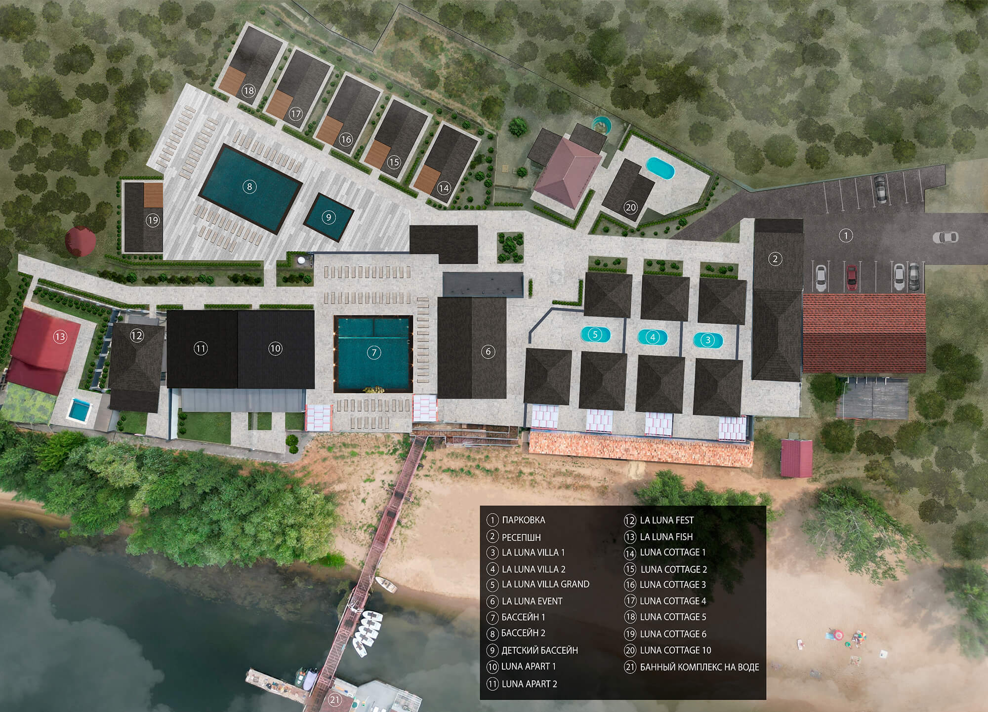 7 коттеджей, 5 вилл, 3 апартаментов, банный комплекс на воде и домики с собственной баней, открытый бассейн с подогревом, бар, ресторан, места для отдыха на берегу реки Ахтуба